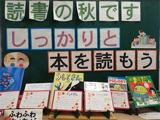| 図書ボランティアのみなさまによる、10月のおはなし会の様子です。今、図書室には先生たちのおすすめの本もかざっているので、みんなで図書室で本を借りて「読書の秋」を感じてください。 | |