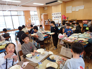 | 今日の給食は、ひなまつりの行事食でした。にこにこ笑顔で給食を食べる2年生の様子です。 | |
