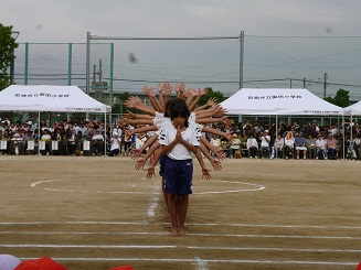 団体演技「The Sharehappi From 4年生 brothers & sisters」は、音楽に合わせてかけ声も元気よくそろっていました。カラフルなバンダナに笑顔がはじけ、リズミカルなダンスを思いっきり発表できました。団体競技「棒引き ~スピーディにパワフルに~」では、頭脳プレーも随所に見られ、すばやく力強くみんなでがんばる姿にお客さんから拍手喝采をいただきました。 |