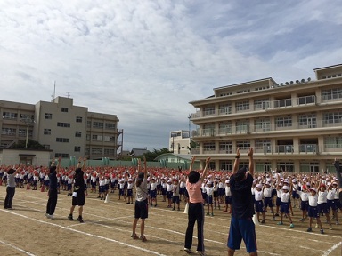 | 体育大会にむけて全体練習が行われました。1年生~6年生まで全員が運動場に集まります。今日は入退場とラジオ体操、歌の練習です。これだけの人数なので体操の隊形に広がるだけでも大変です。当日はスムーズに進行できるように頑張っています。 |