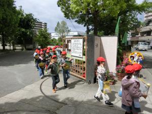 5月8日(水)、3年生が校区探検に出かけました。本校の校区は広く、校区の中には神社やお寺、市の施設などがたくさんあります。今日はみんなで「どこに」「何があるか」「どんなものか」見てきました。 |