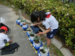 5月9日(木)、2年生が生活科の学習で育てる、ピーマン、ミニトマト、ナスの苗を自分たちの植木鉢に植え替えました。子どもたちは茎が折れないようにやさしく苗を持ち、慎重に植え替えをしていました。植え替えが終わったら、タブレットを使って苗の観察をしました。 |