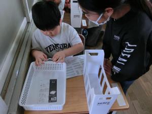 5月9日(木)、6年生が1年生の名前シール貼りのお手伝いをしました。名前シールは1年生がロッカーの整理整頓に使うボックスに貼りました。シールを張った後は学習道具をボックスに入れてロッカーにしまいました。とてもきれいに片付けることができました。 |