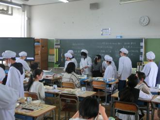 4月17日(木)から始まる1年生の給食に向けて、栄養教諭が1年生に「たのしいきゅうしょく」の授業をしました。授業では、給食室で給食ができるまで、給食の準備、給食当番の仕方(エプロンのたたみ方も)、給食の待ち方、食べ方、給食の片づけ等、給食に関することをクイズを交えながら楽しく勉強しました。1年生の小学校で初めての給食のメニューは、カレーライス、牛乳、フレンチサラダです。おいしいカレーライスを食べて、みんなが給食を好きになってほしいです。 |