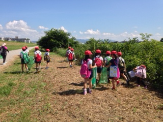 川の増水と雨で延期になった環境学習ですがこの日は晴天で、汗ばむ陽気の中で活動できました。 子どもたちは友だちと協力しながら、河川敷のゴミを掃除したり、川に入って生き物を探したりして、環境についての様々な体験学習をしました。