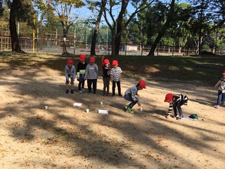 11月8日、身近にある「秋」を見つけに、猪名川自然林へ行きました。大きなまつぼっくりや、いろいろな形や色のどんぐりを見つけて、子どもたちは大興奮でした。どんぐりリレーや秋に関するビンゴをするなど、とても楽しく学習しました。