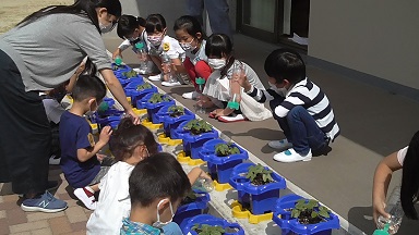 4年生の先生たちで畑にひょうたんの苗を植えました。