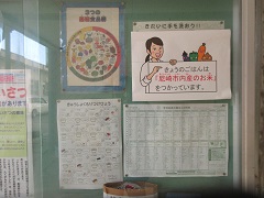また、クラスで作った給食カルタもランチルーム前に掲示しています。