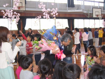 児童からの花束贈呈です。 続いて、育友会からの花束贈呈です。