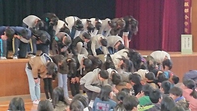楽しい思い出を…お別れ会6年 おうちの人を招いてみんなでお別れ会をしました。ダンスや寸劇、思い出ムービー、茶話会など、色々な出し物や企画を楽しみながら、共に時を過ごしました。中学校への進路はそれぞれですが、皆で過ごしたこのひとときを楽しい思い出としたいです。 感謝の気持ちをこめて、さいごはおうちの人へのお礼で幕を閉じました。