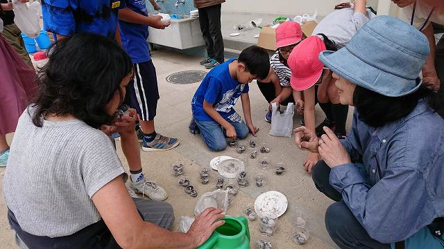 | 余ったたねダンゴは容器に入れて、おうちに持ち帰って育てます。夏には色とりどりの花が咲くことでしょう。 | |