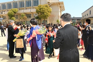 | ☆3月1日、朝の時間に、日頃お世話になっている7名の方に来て頂き、「交通指導感謝の会」を実施しました。例年なら、全校生543名が体育館に集まり、1年生から花束を渡して、全校生でお礼を言うのですが、今年度は「感染防止対策の徹底」の為、6年生103名と5年生の児童会役員のみの参加となりました。 ☆ただ、突然の休校措置で実施できなかった昨年度とは違い、日々登下校を見守って下さっている方々に感謝の思いを伝えることができて良かったです。 ☆お世話になっている皆さんから一言ご挨拶頂き、6年生から感謝の花束を渡し、児童会代表がお礼を言う様子を、写真でご紹介します。 |
