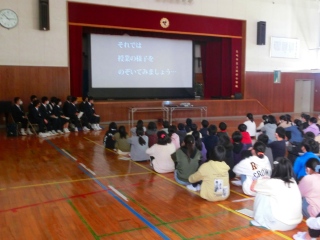 ☆3月11日の6時間目。小園中学校の生徒会役員10名が、上坂部小学校に来てくれました。 「緊急事態宣言」が出て実施できなかった「小園中学見学会」の代わりに、中学生が上小に来校し、中学校の授業やクラブ活動の様子を、6年生に教えてくれました。明るく楽しい雰囲気が伝わる学校紹介の動画を見たあと、中学校生活Q&Aタイムがありました。6年生の一人が「中学校では、先輩と後輩の上下関係は、どんな感じですか?」と聞くと、「後輩は、先輩に対して敬語を使います。でも、先輩は、みんな優しいから大丈夫ですよ。」と答えてくれました。 ☆今回の《生徒会役員による出張説明会》のあと、中学生が《上坂部小学校6年生》のステキな点・良い点を3つ教えてくれました! ①体育館の会場に入った時に自然と会釈をしてくれた。 ②授業&クラブ紹介動画の上映終了後、みんな拍手をしてくれた。③私たちの話を聴く態度がすごくよかった。 さすが、《上小6年生》ですね。 ☆小園中学校生徒会役員の皆さん、本当にありがとうございました! |
