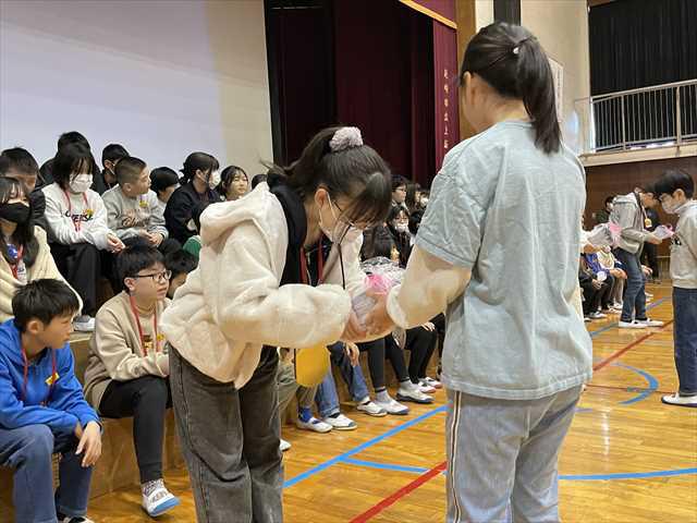 卒業まで残り1週間となった6年生に、全校生で感謝とお祝いを伝える会を行いました。ダンスや劇、詩の群読などで伝えた学年、マグネットやメモ帳、メダルなどのプレゼントを作って贈った学年、みんなそれぞれに思いを込めました。