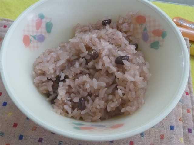 赤飯はもち米に小豆を炊いた煮汁を吸水し蒸した「おこわ」のことを指しますが、給食ではアルファ化米を炊飯しています。