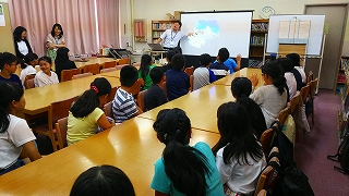 7月29日(月)、中央中学校区にある難波の梅小学校、難波小学校、竹谷小学校の6年生117名が、社会・数学・体育・理科の中から2教科を選択し、本校の教室や体育館で授業を受けました。