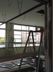 ・全国的に特別支援学校通学生や特別学級入級生徒が増加する中、本校でも本年度から特別支援学級(知的)が増設されました。ようやく夏休みから新装工事が始まりました。完成は今月中旬とのことです。仮教室で学習している2名は、完成を心待ちにしています。