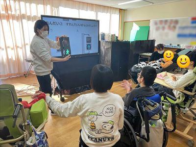 先生と一緒に体験学習をする中で、信号の色や左右を確認し、手を挙げて渡ることができました。